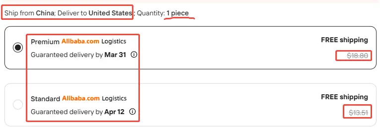 For newly registered buyers, Alibaba offers a first-order shipping coupon of up to $20. If the shipping cost falls within this amount, it may appear as “Free Shipping.”