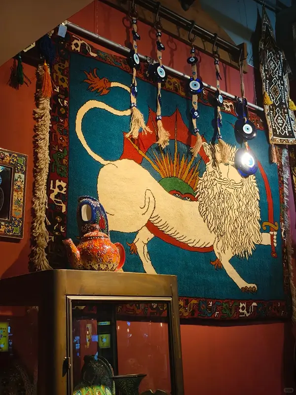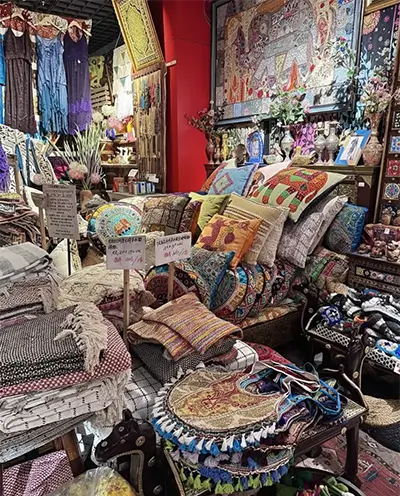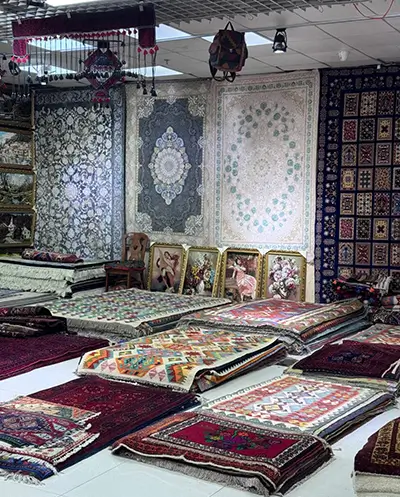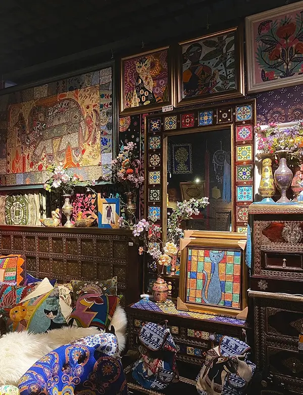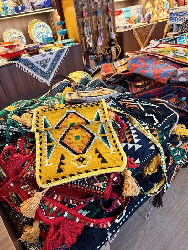 Persian-style patterned cushion covers, wall tapestries, and woven bags are commonly available, featuring bold motifs and ornamental patterns.
