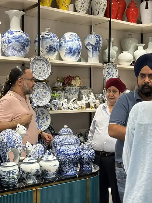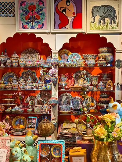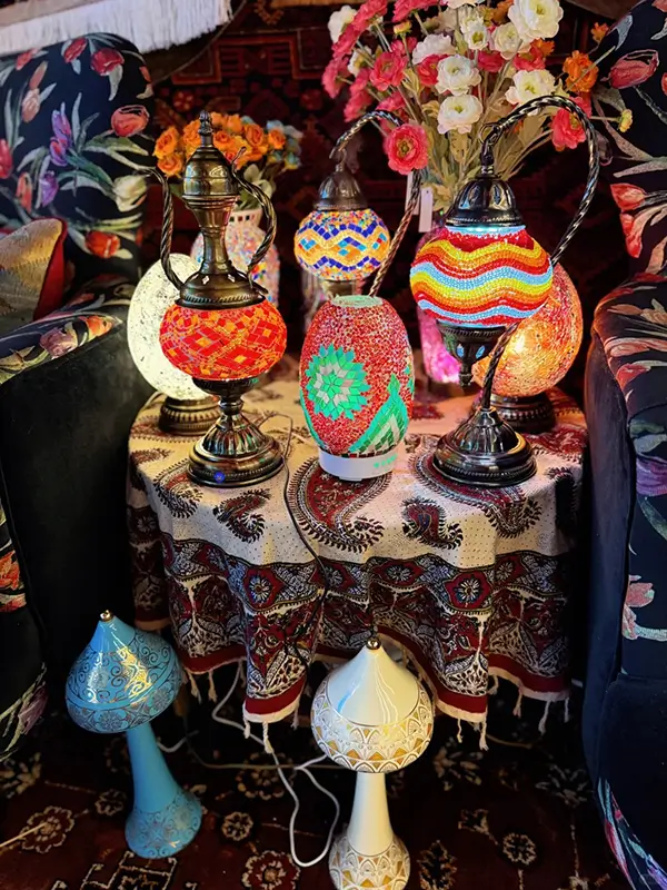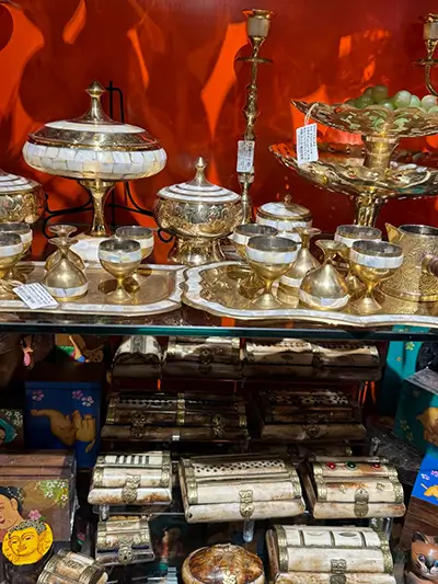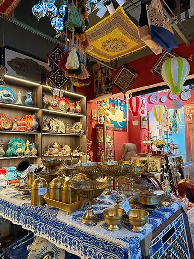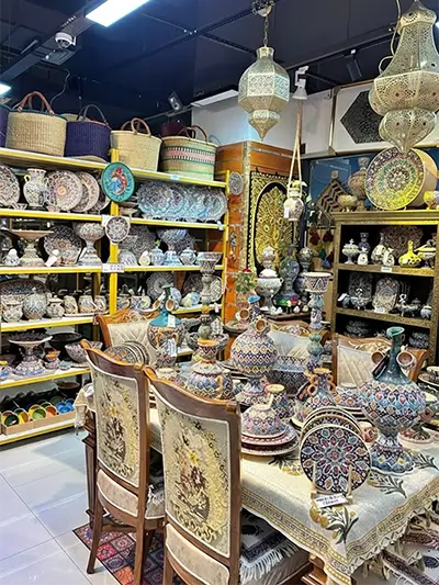Persian-style tile décor, handmade Turkish ceramic bowls, metallic-finish tea sets, and brass serving bowls with gold-toned finish are widely seen across the market.